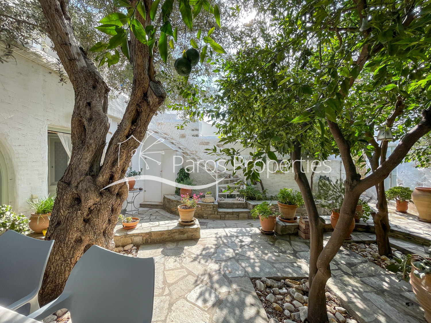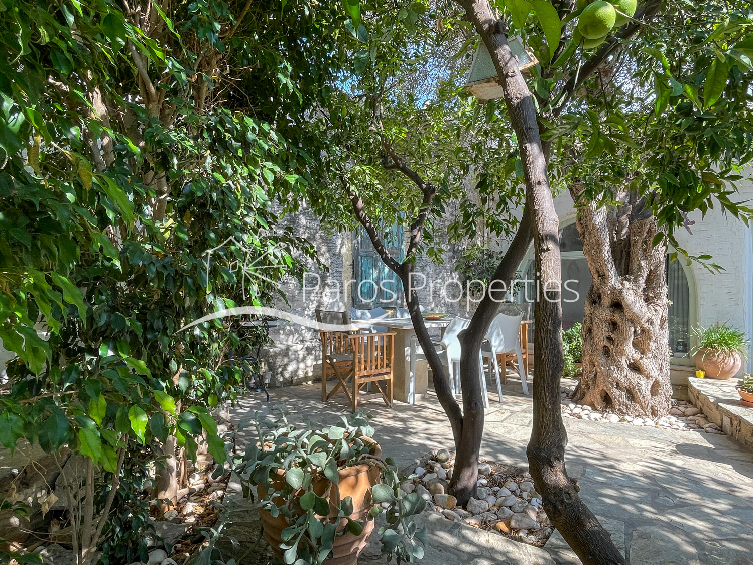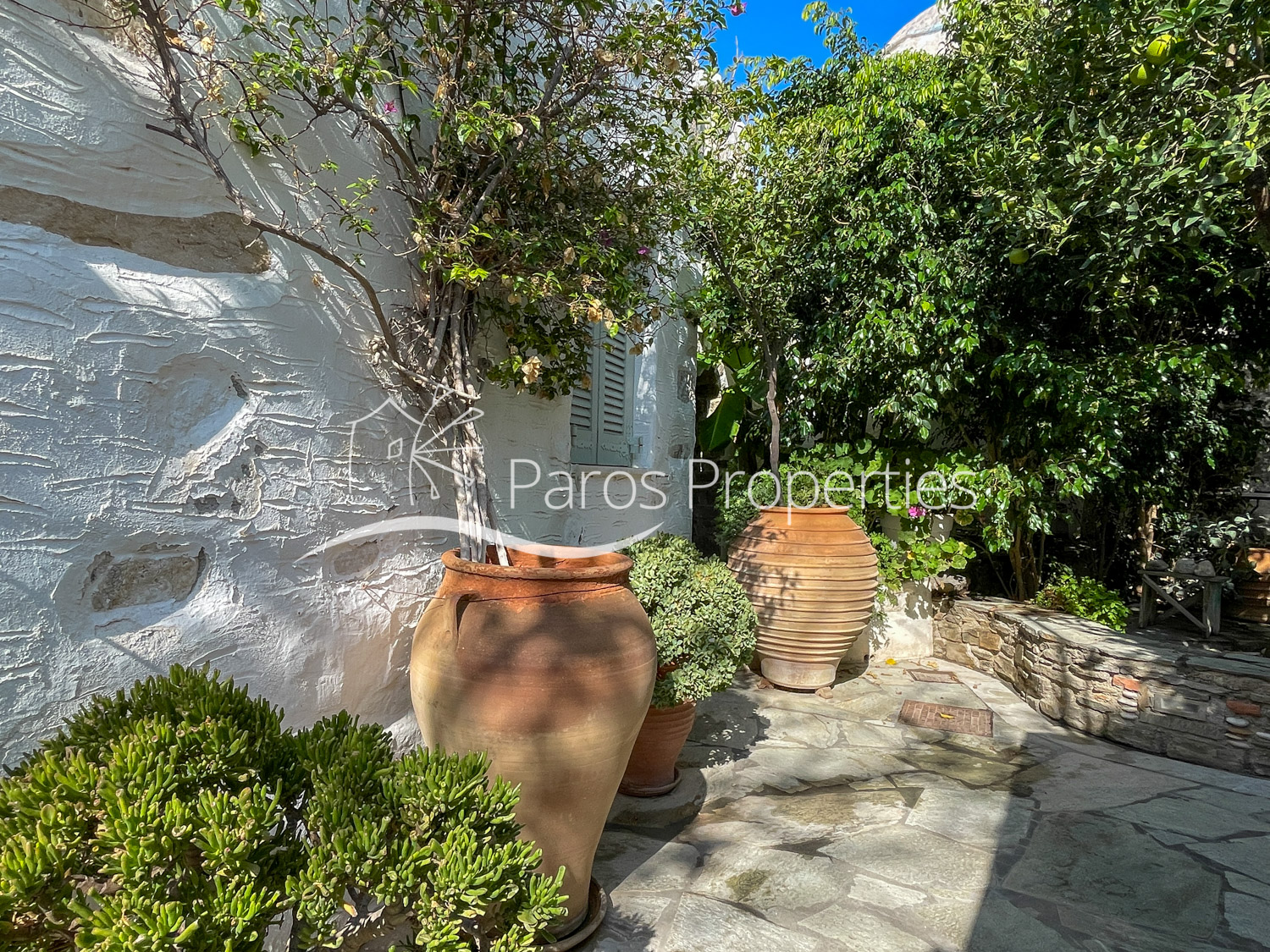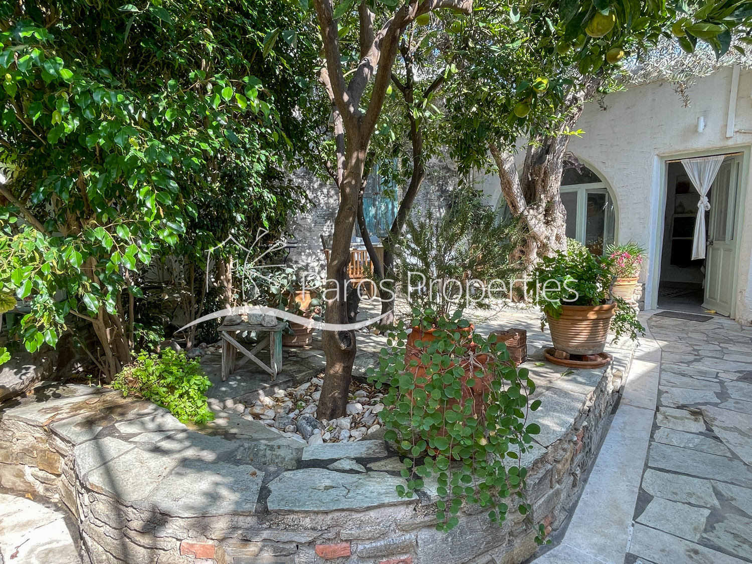 Το υπέροχα διατηρημένο αυτό ακίνητο αποτελείται από δύο ανεξάρτητους όγκους που βρίσκονται εκατέρωθεν ενός εντυπωσιακού ιδιωτικού κήπου 80 τ.μ. — ένα στοιχείο πραγματικά σπάνιο μέσα στον παραδοσιακό οικισμό.