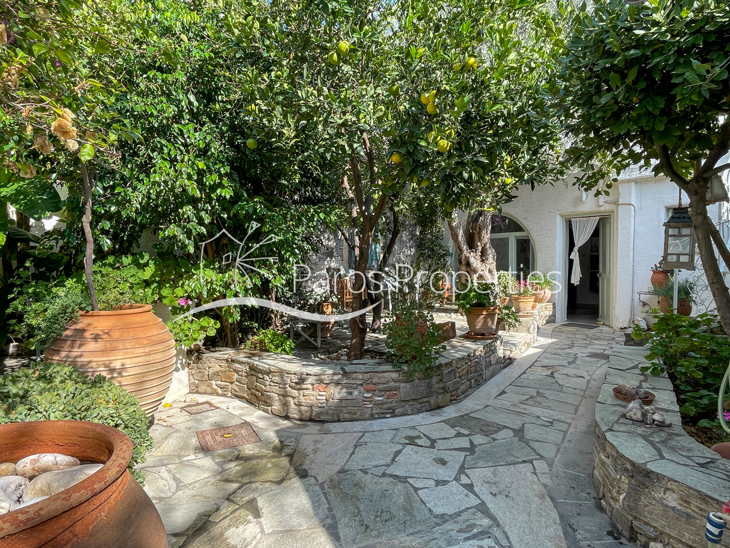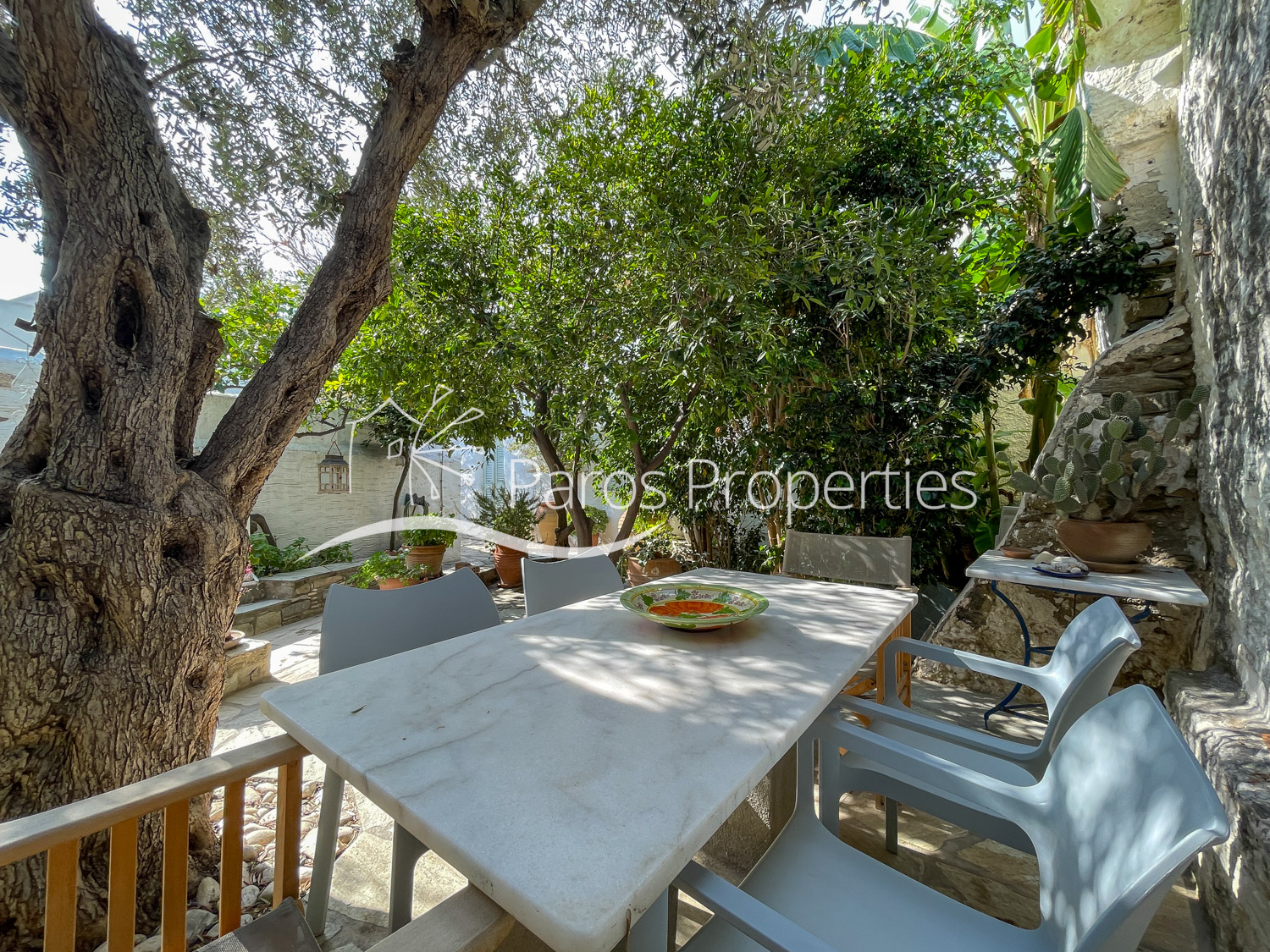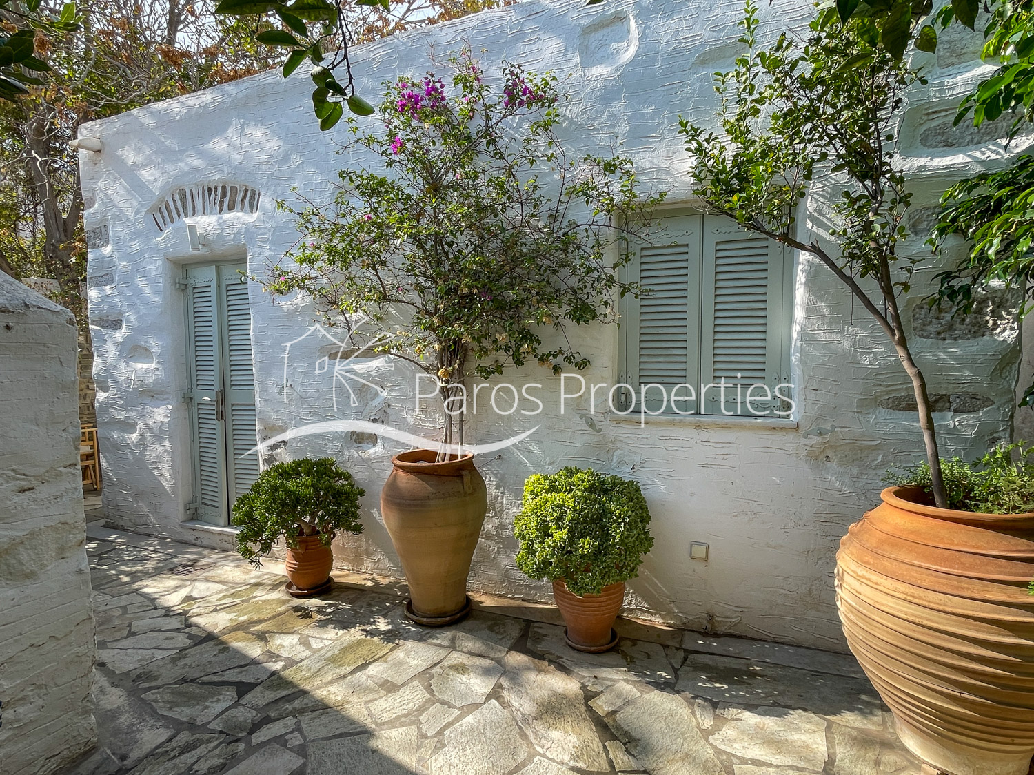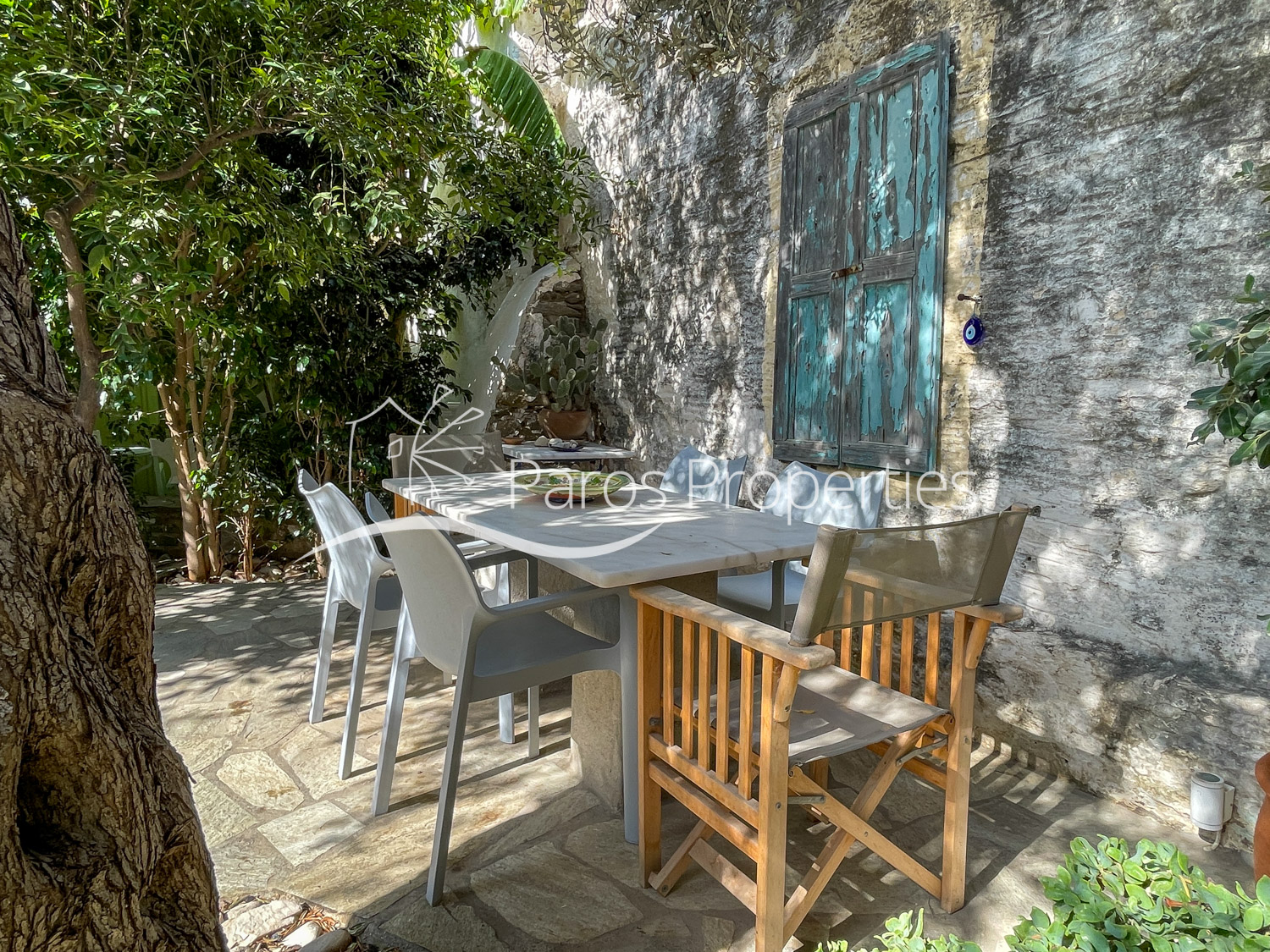 Το υπέροχα διατηρημένο αυτό ακίνητο αποτελείται από δύο ανεξάρτητους όγκους που βρίσκονται εκατέρωθεν ενός εντυπωσιακού ιδιωτικού κήπου 80 τ.μ. — ένα στοιχείο πραγματικά σπάνιο μέσα στον παραδοσιακό οικισμό.