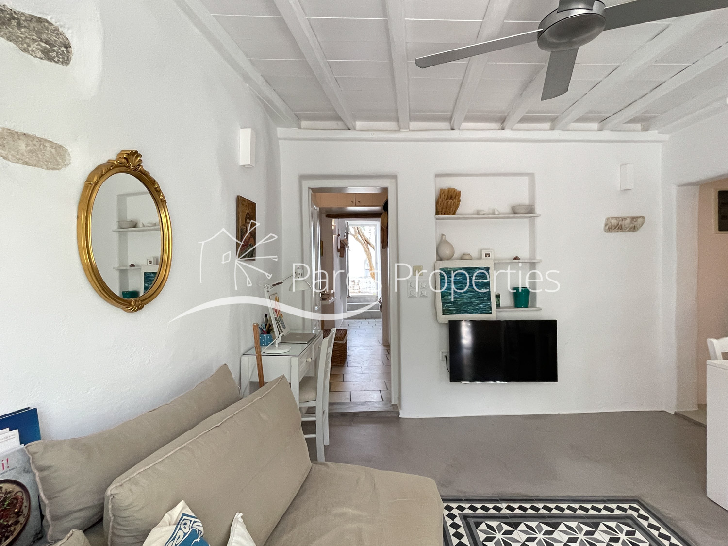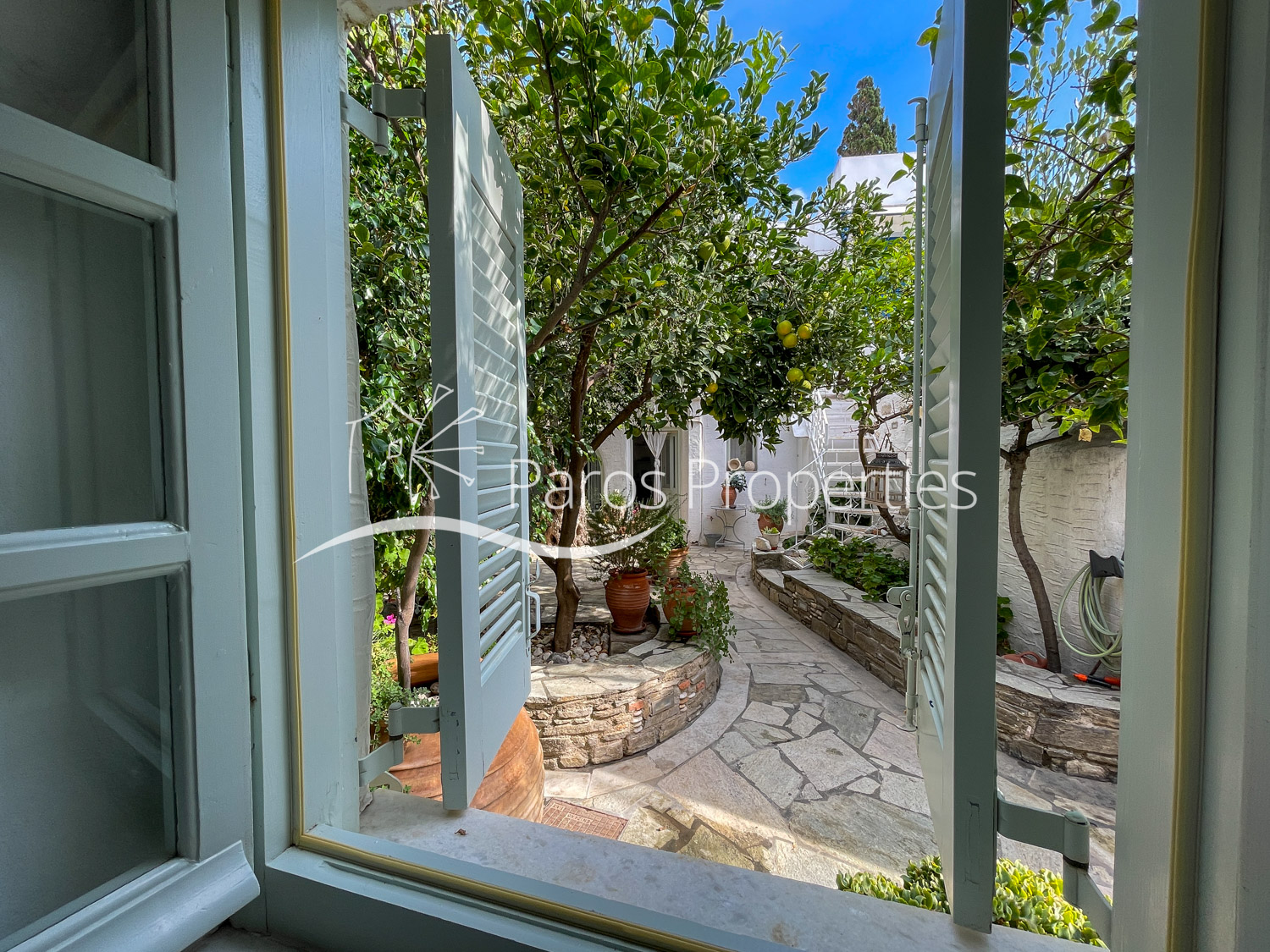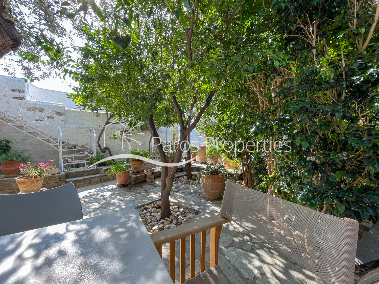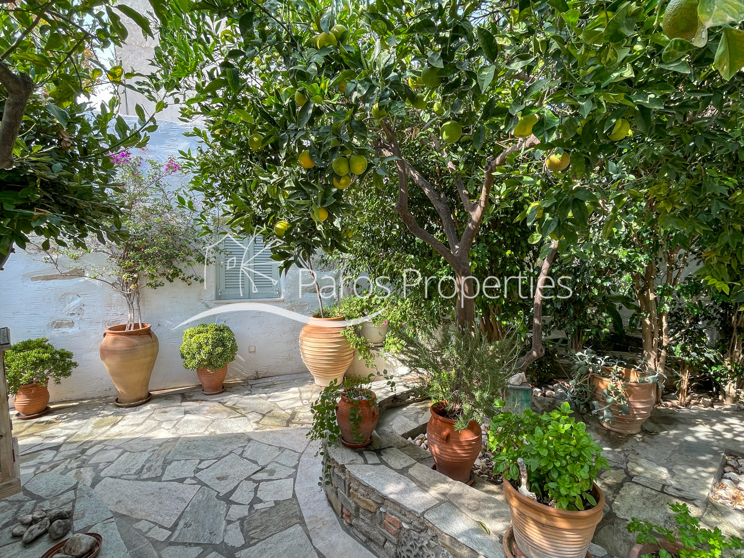 Το υπέροχα διατηρημένο αυτό ακίνητο αποτελείται από δύο ανεξάρτητους όγκους που βρίσκονται εκατέρωθεν ενός εντυπωσιακού ιδιωτικού κήπου 80 τ.μ. — ένα στοιχείο πραγματικά σπάνιο μέσα στον παραδοσιακό οικισμό.