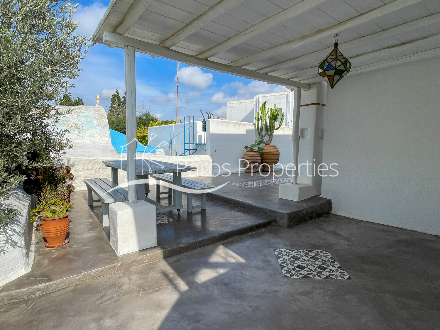 Μια εξωτερική σκάλα οδηγεί σε μια ευρύχωρη και όμορφα διαμορφωμένη ταράτσα 54 τ.μ. πάνω από την κύρια κατοικία, ιδανική για στιγμές χαλάρωσης ή για φιλικές συγκεντρώσεις μέσα στην ήρεμη ατμόσφαιρα του οικισμού.